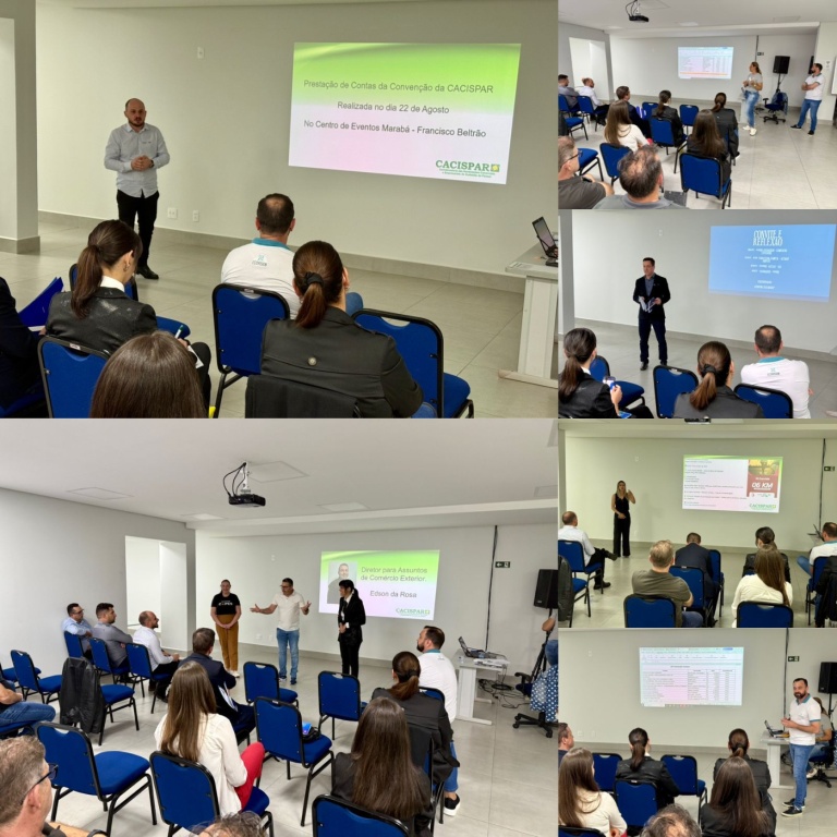 Um dos principais assuntos da pauta foi a prestação de contas da 22ª Convenção da Cacispar, realizada em agosto deste ano. A apresentação foi conduzida por Neodimar Moterle, diretor da Cacispar, e Vanessa Ribeiro, executiva da entidade.